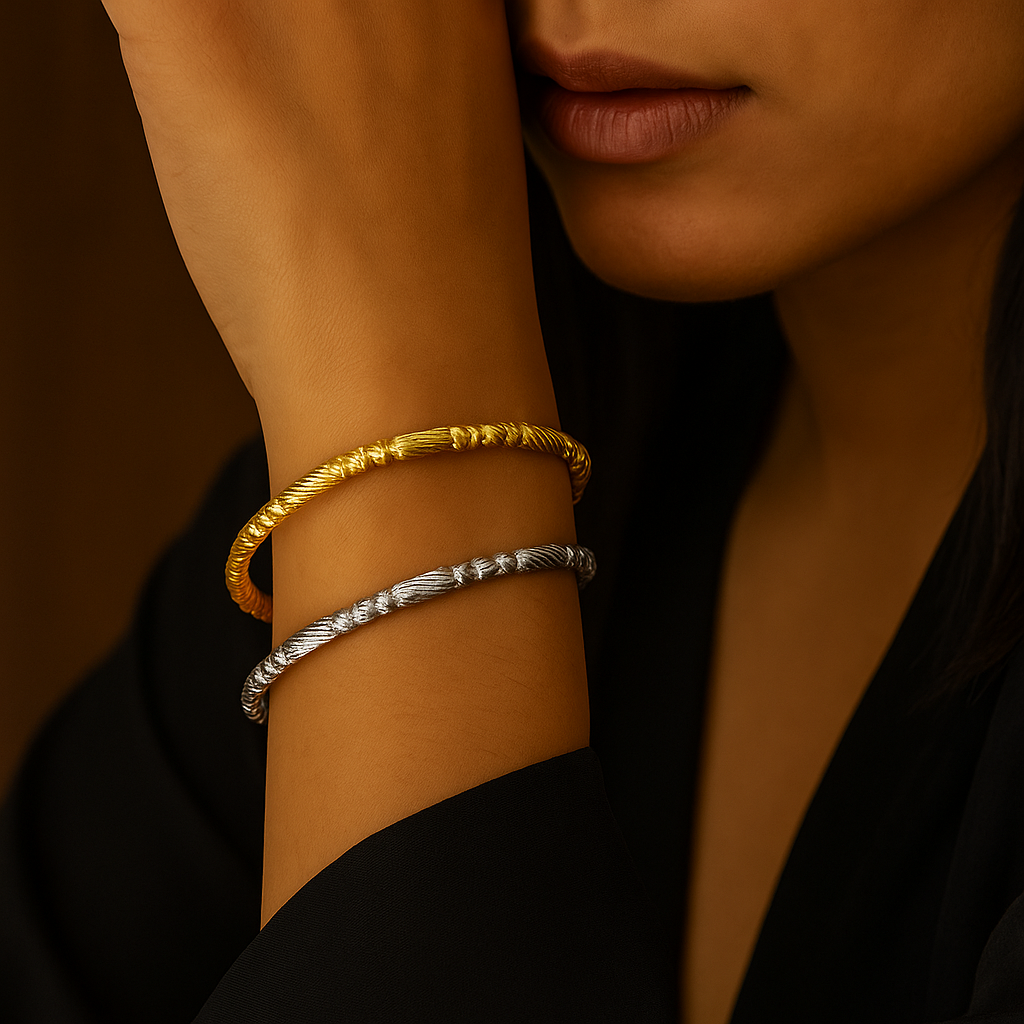 Available in classic gold and sleek silver, the AuraFlex Bangle is your perfect blend of durability, versatility, and luxury – made for everyday wear, yet styled for every occasion.