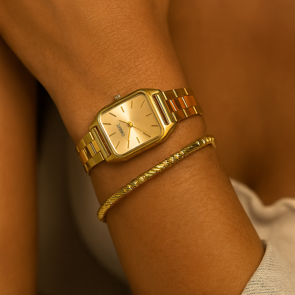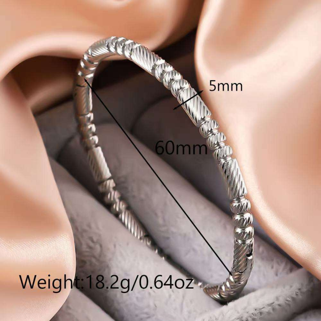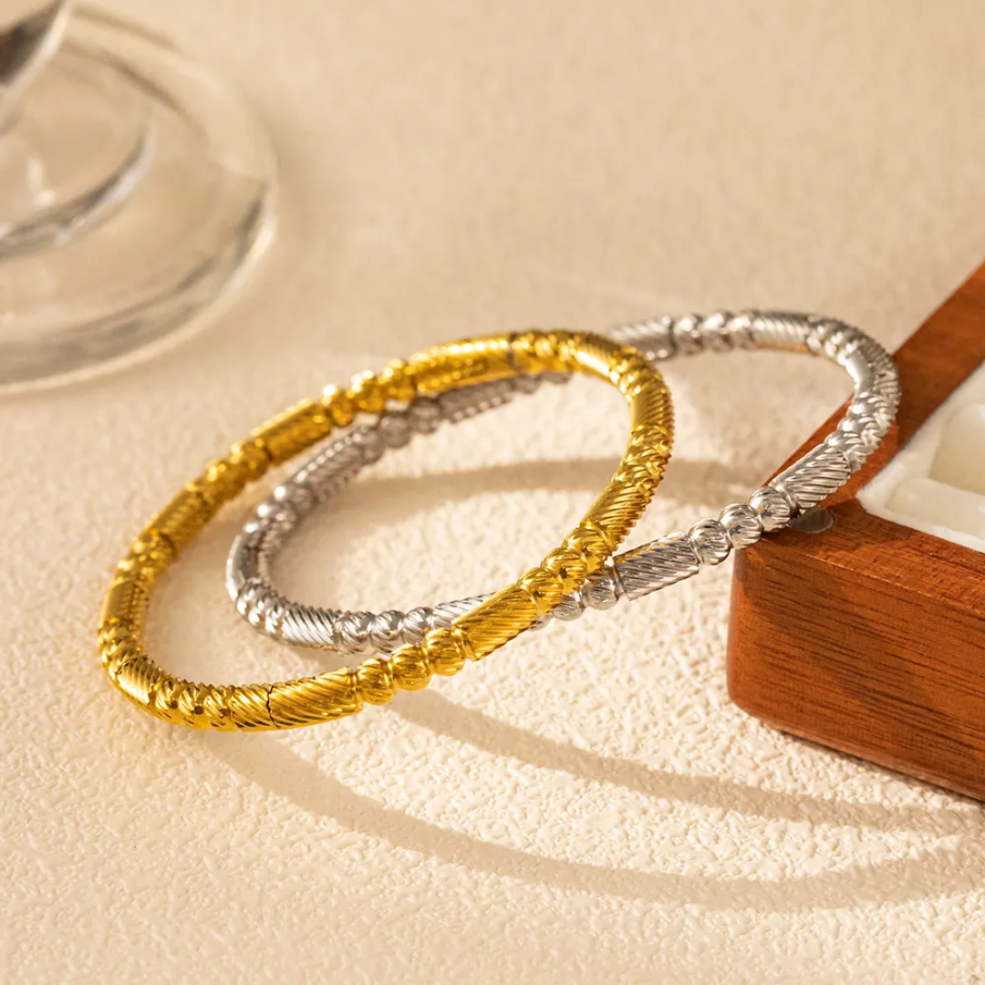 Crafted in stainless steel with rich 18K gold plating, this bangle is anti-tarnish, hypoallergenic, and skin-friendly, ensuring comfort and shine that lasts. Its flexible, textured design makes it a true stackable essential – wear it solo for subtle sophistication or pair it with your favorite watch and other bangles for a high-fashion statement.