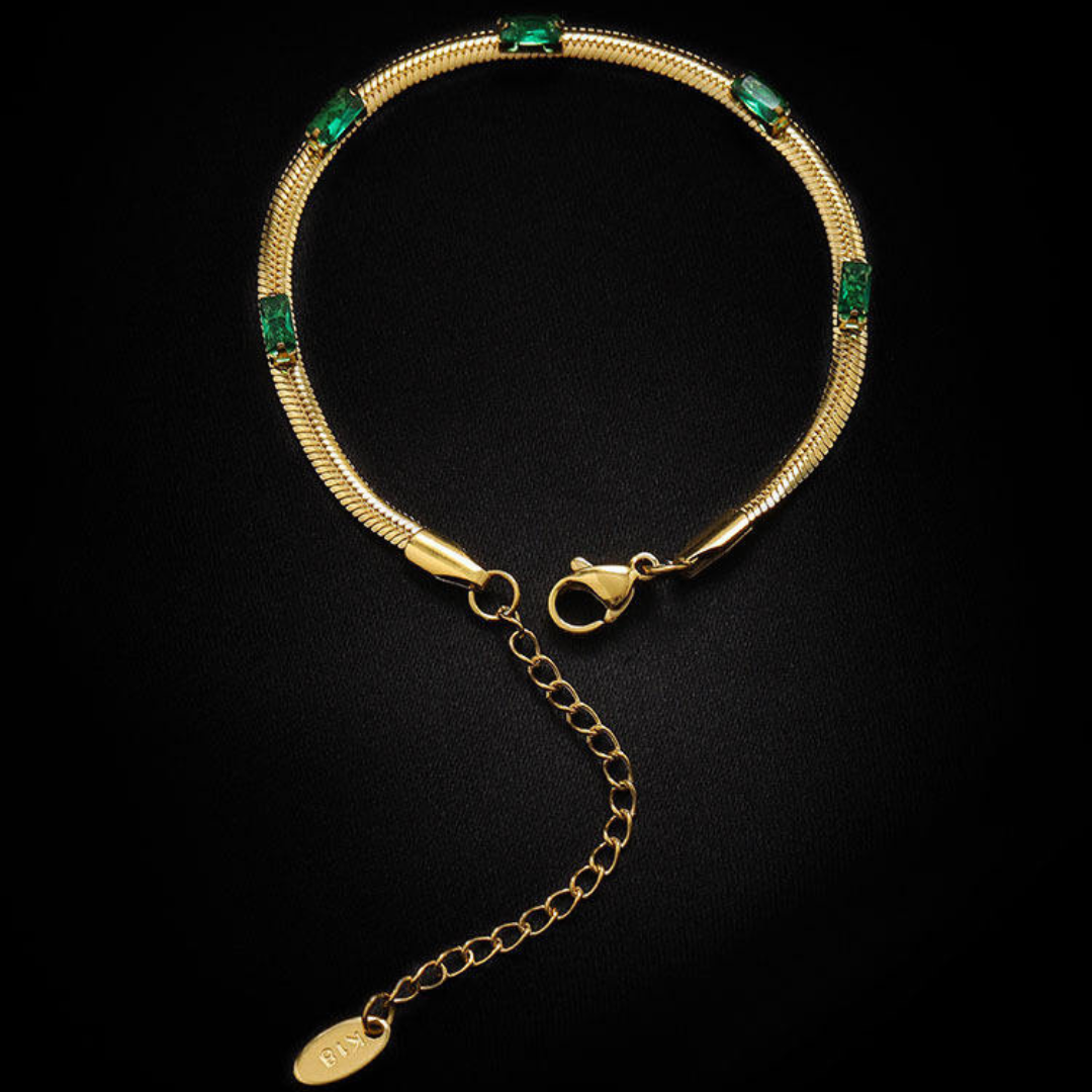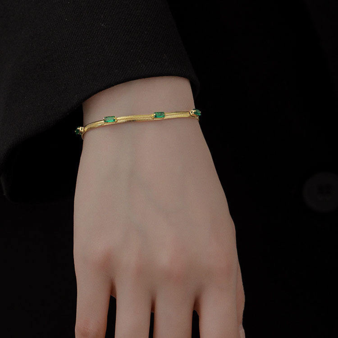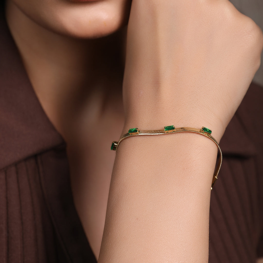 Subtle luxury that turns heads — meet the Emerald Grace Sleek Bracelet, where elegance meets everyday wear. Crafted from premium stainless steel and plated in 18K gold, this beauty is adorned with emerald-green stones that shimmer with every move.
