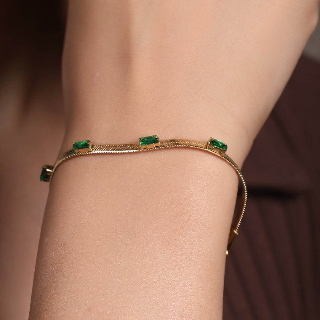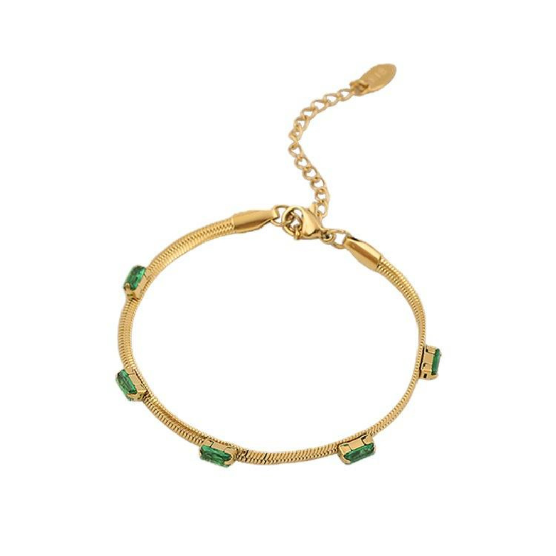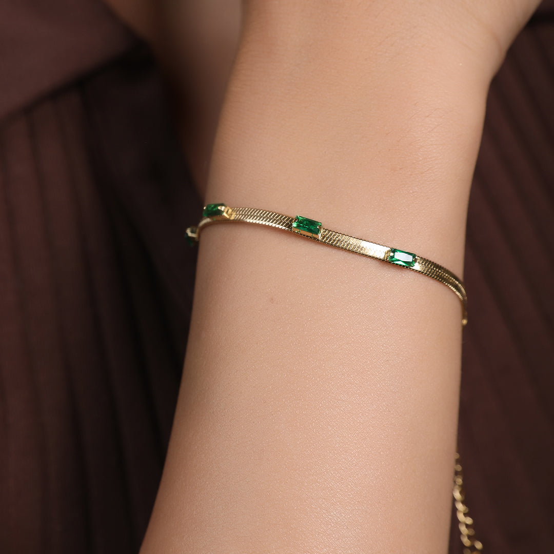 Subtle luxury that turns heads — meet the Emerald Grace Sleek Bracelet, where elegance meets everyday wear. Crafted from premium stainless steel and plated in 18K gold, this beauty is adorned with emerald-green stones that shimmer with every move.