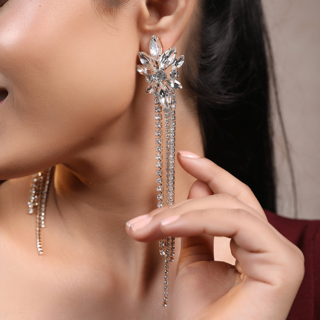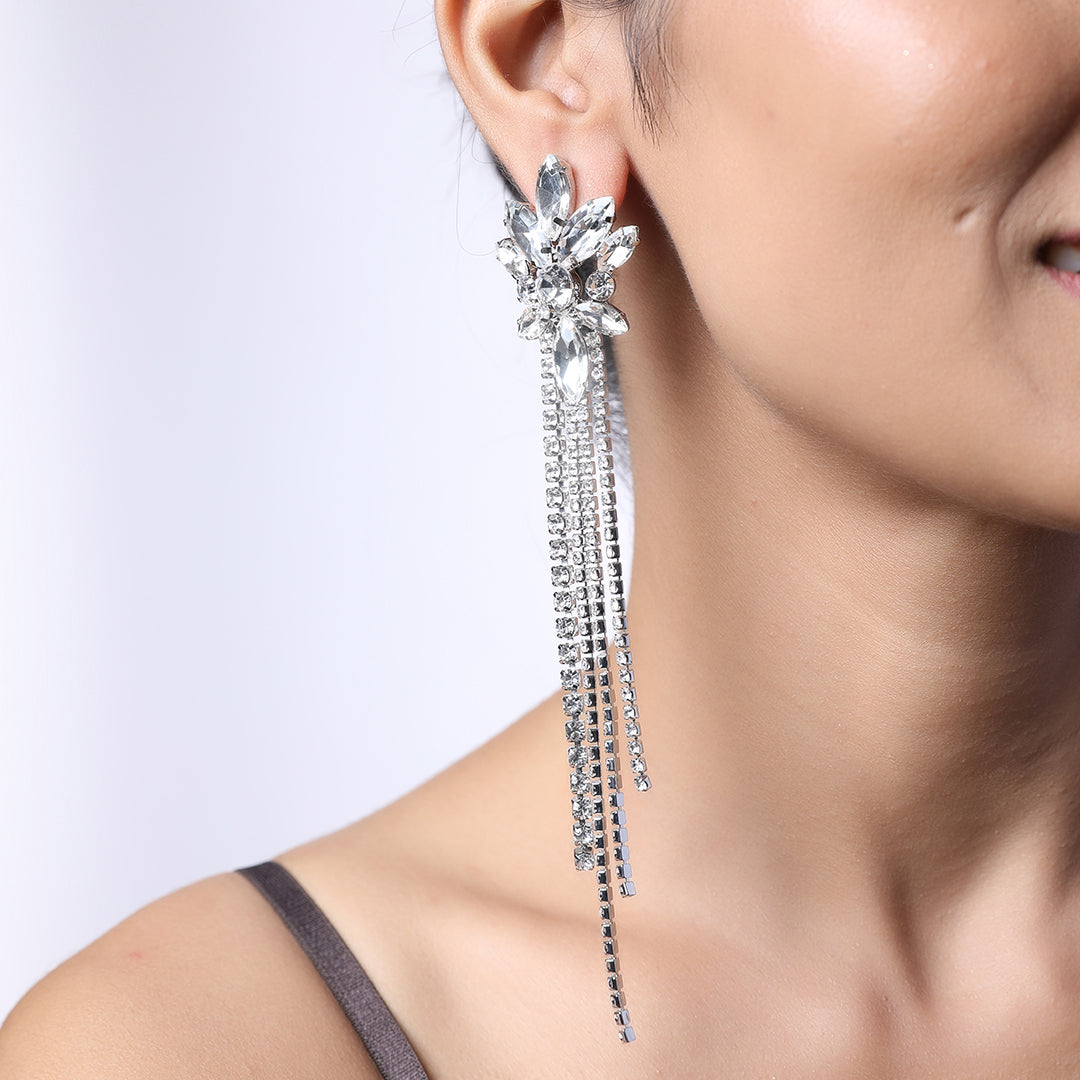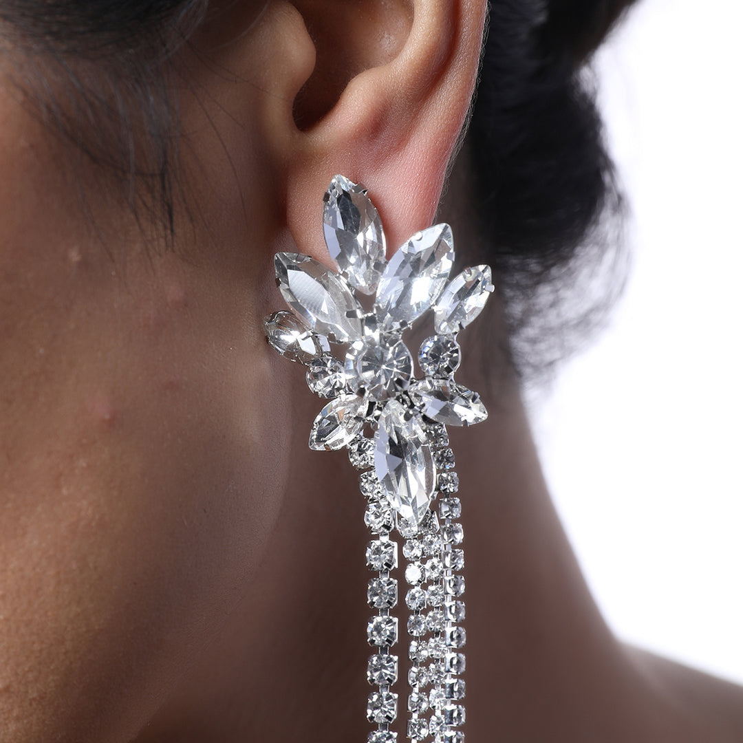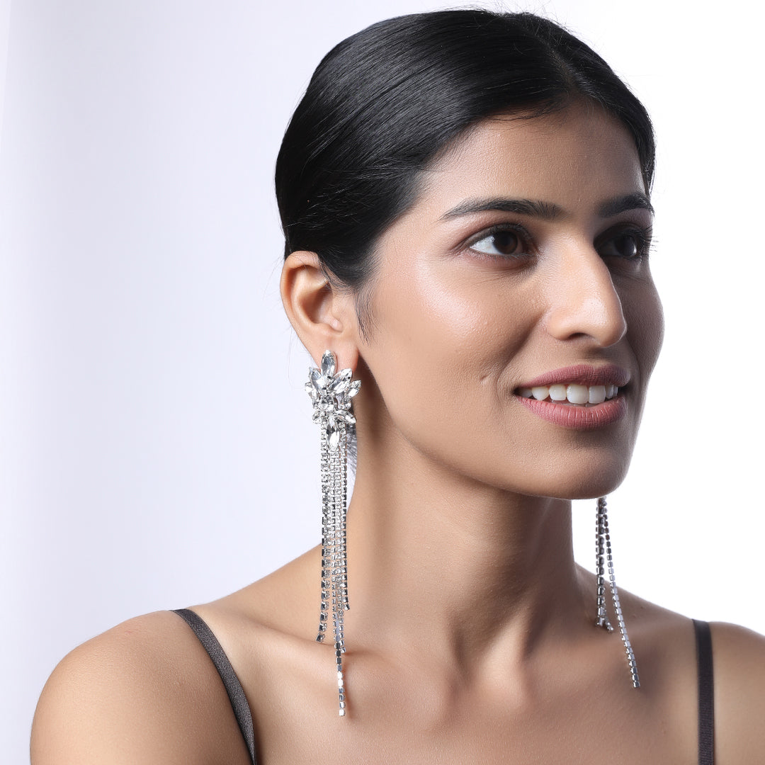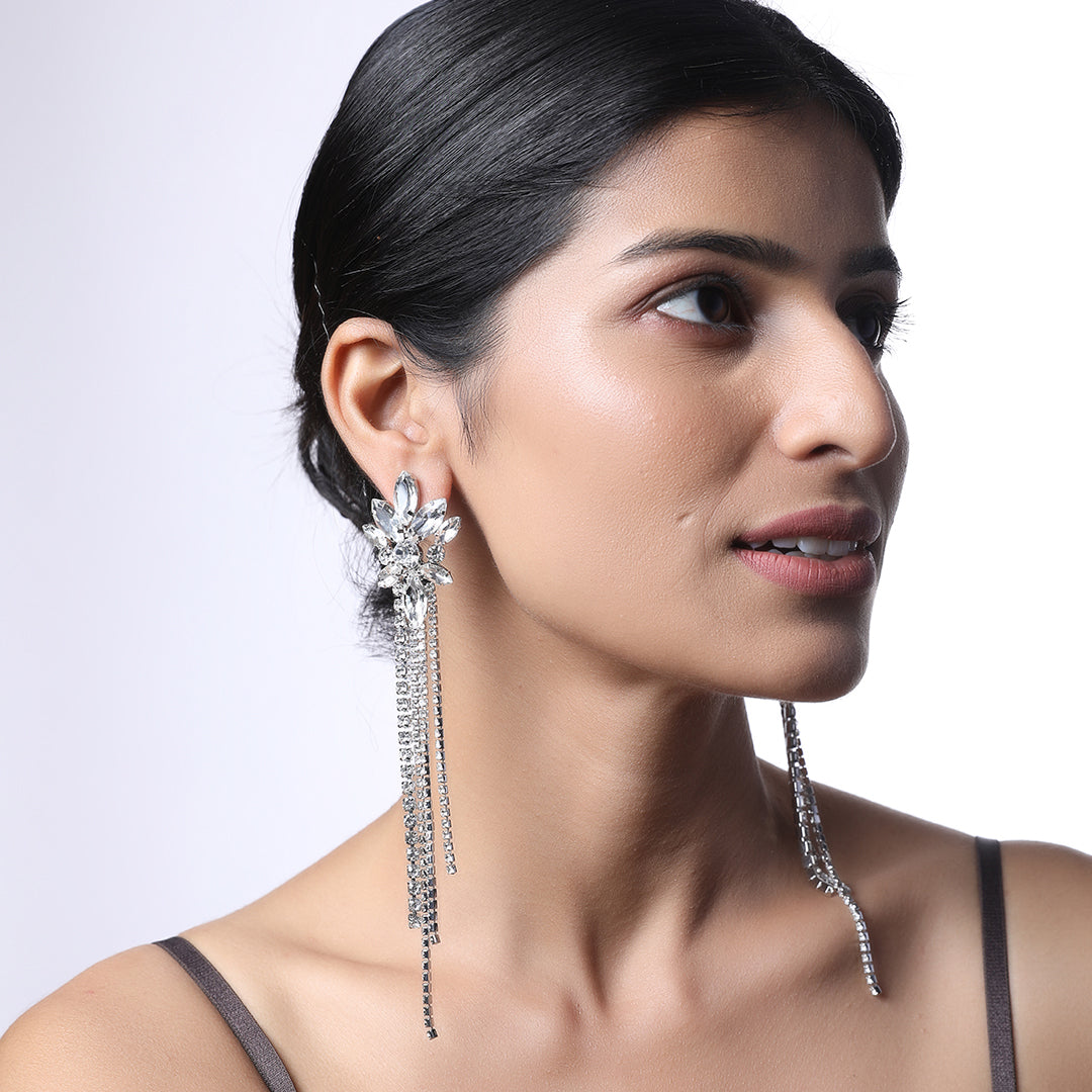 The Midnight Bloom Crystal Earrings bring major glam with their dazzling rhinestone petals and waterfall chains that move as you do.