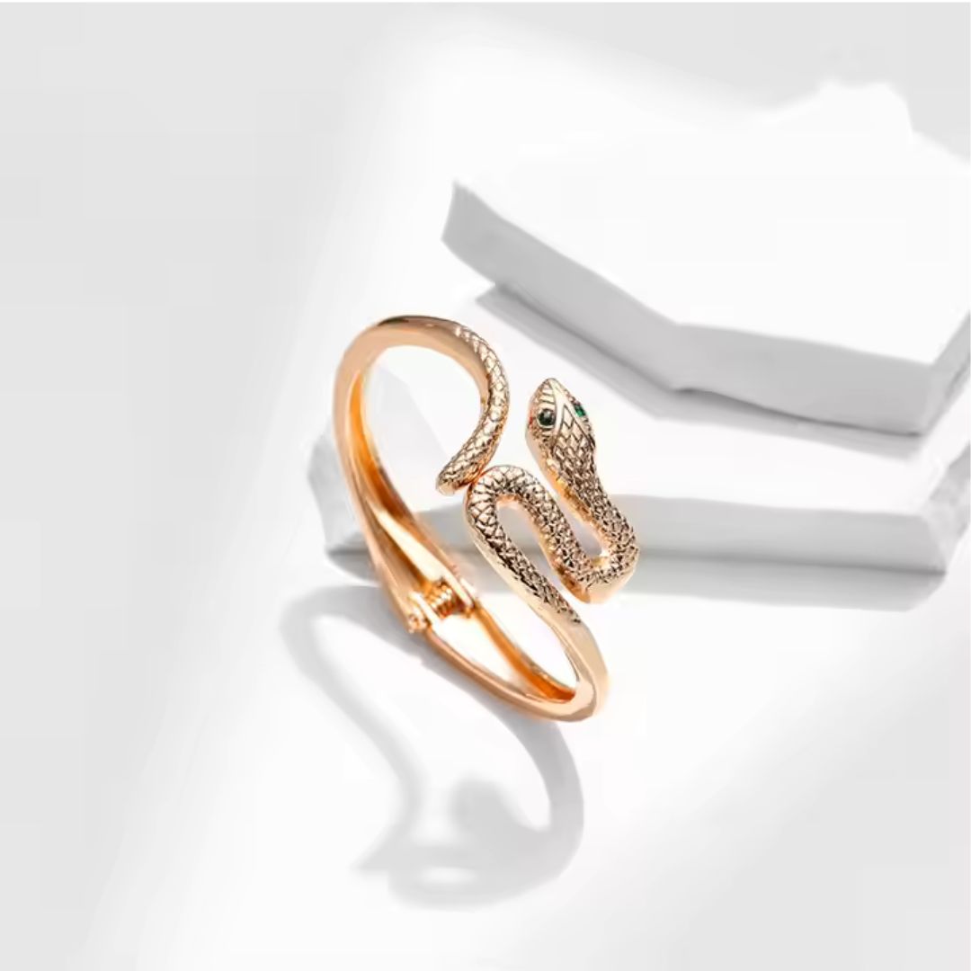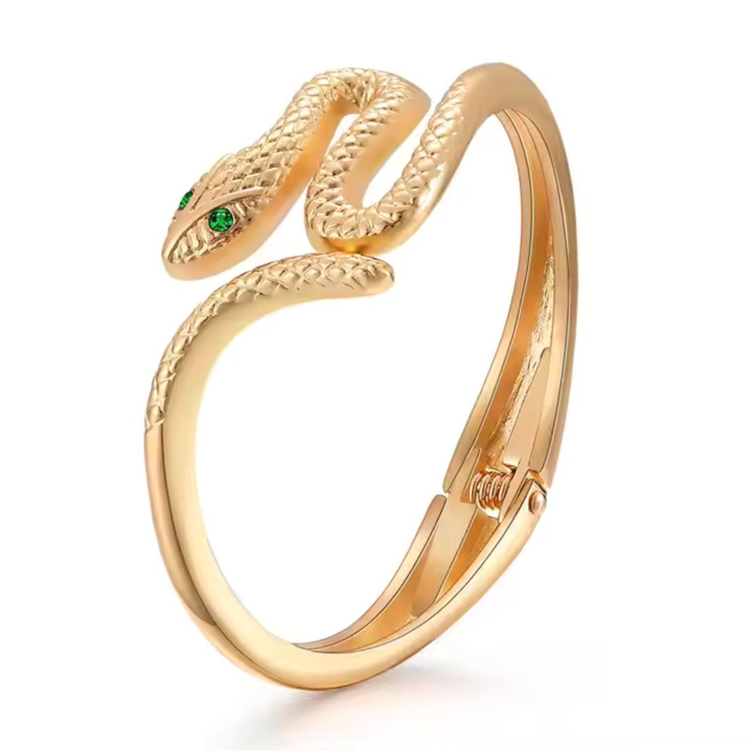 The Enchanted Coil Snake Bracelet brings bold symbolism to your style. Crafted from durable zinc alloy with a rich gold-plated finish, this serpent-inspired bangle wraps gracefully around your wrist, crowned with captivating emerald green eyes. Lightweight, tarnish-resistant, and sculpted for comfort, it’s designed to unleash your inner power — elegantly.